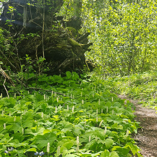 Fields of strawberries (Fragia) covered the high eastern ridge we climbed in the cool and cloudy morning. We could only glimpse pieces of Loowit's west flank as we ascended the 1000 foot ridge. We wove in and out of alder groves dripping with candy flower (Claytonia), Trilliums,, Corydalis, Viola, bleeding hearts (Dicentra), Cohosh (Actaea rubra) and inside out flower (Vancouveria). on the open were masses of Lupinus and Paintbrush (Castejilla). The evergreen huckleberries (Vaccinium ovatum) were bronzed with new growth. Some in the group took notice that the color was as vibrant as fall foliage. The Willows were creating a fairy wonderland with their fluffy cotton dancing in the subtle breeze as we descended into the lake valley around 1pm. We followed our excellent navigator to an open beach on the lake and ate a well deserved lunch with our boots off grounding in the sunshine. As we walked out along the west side of the lake, the team popped in and out of alder groves into open sunny meadows, crossed streams and waterfalls spilling from the steep west ridge, and gazed at distant snow dusted Cascade peaks west of Loowit across the vibrant mountain lake. It was a fantastic day!